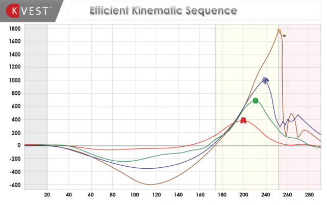 The kinematic peak speed sequence tells you the order in which, during a swing, your player’s body segments hit their peak rotational velocities. The most efficient pattern is pelvis, torso, lead arm then lead hand.
