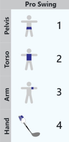 - The 1-2-3-4: This is pelvis peaks before torso, torso before lead arm, and lead arm before the hand / club. This is an efficient pattern that many top golfers have. The peak speed of each segment is in order from the ground up to the hand / club. This sequence allows for efficient transfer of energy for generating power.