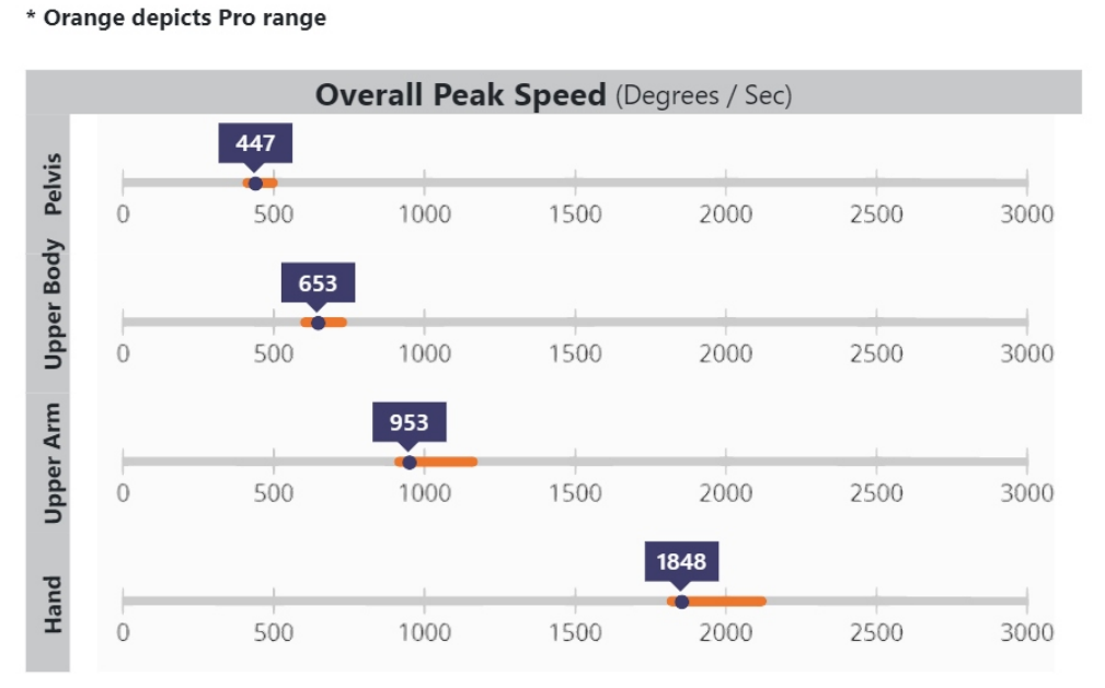 Kinematic speeds are the rotational velocities of each body segment during a swing. A player’s kinematic peak speeds are the fastest velocities that each body segment rotates at during a swing.